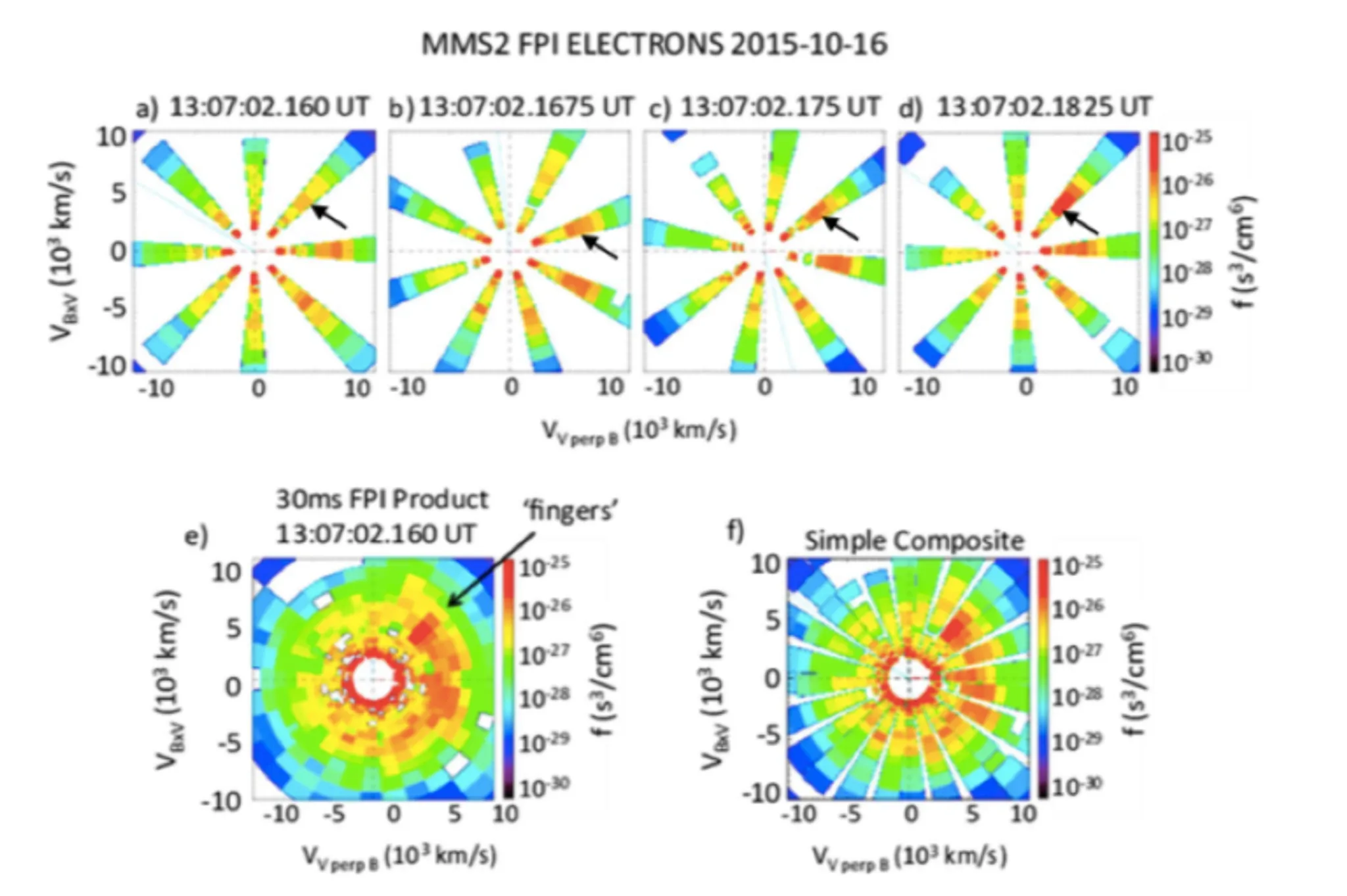So Amy Rager, a graduate student at NASA’s Goddard Space Flight Center in Greenbelt, Maryland, and her MMS colleagues came up with a new technique to help them analyze this briefer-than-brief event. Rager’s idea was to look at one deflector angle at a time instead of pooling them together. For each angle Rager separately interpolated the data — essentially reading between the lines and connecting the dots to gather extra data points. This allowed for measurements just 7.5 milliseconds long! The resolution of the data was reduced, since they were only looking at a fourth of the data as before, but it allowed the scientists to understand what was going on in these fleeting, action-packed moments.