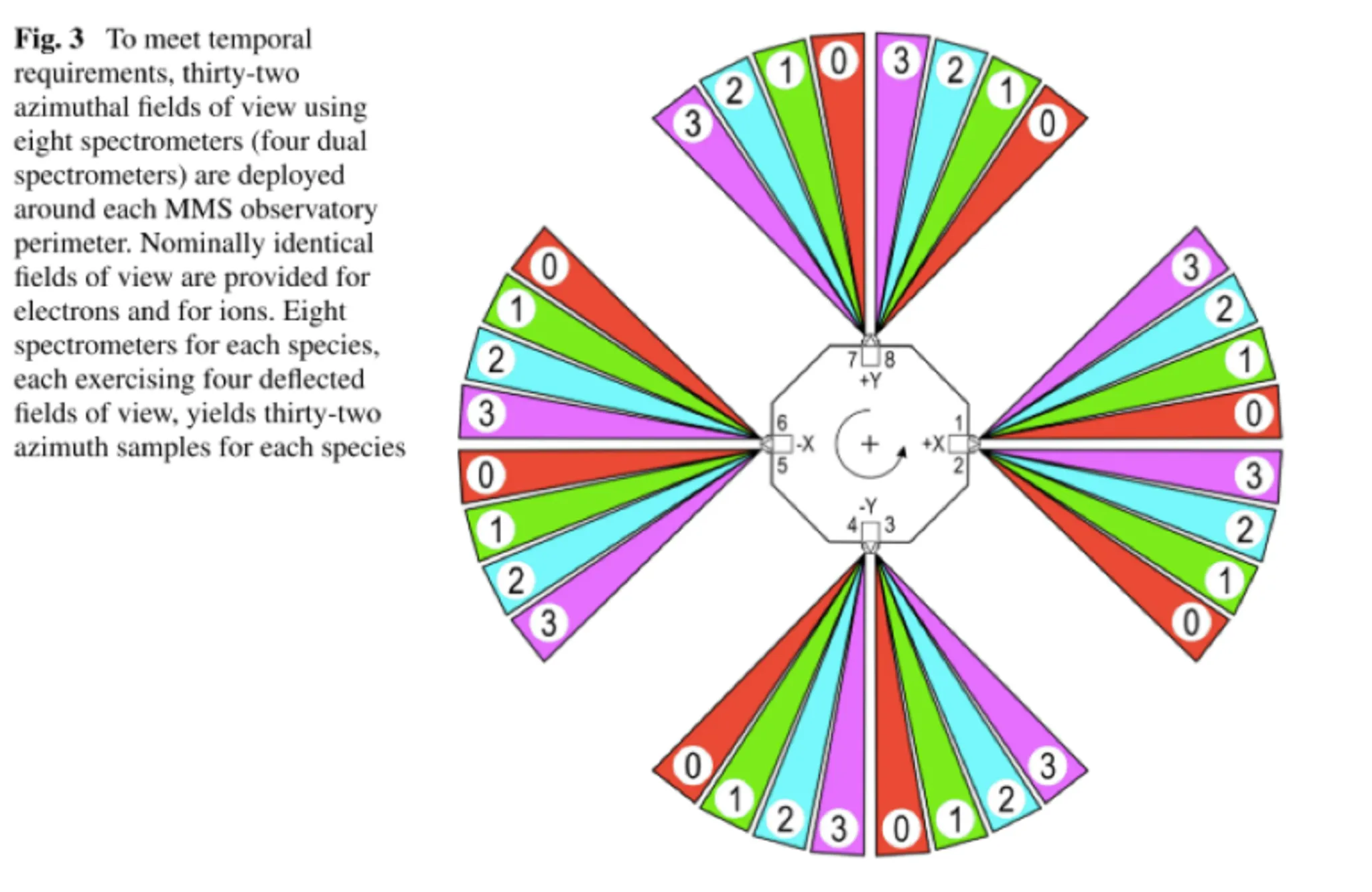 MMS detects particles using its Fast Plasma Investigation instrument, or FPI. Similar instruments on previous missions were designed to take advantage of the spacecraft’s spinning to gather measurements with one sensor as it swept a 360 degree view, much like a lighthouse beacon surveys the sea. FPI, however, uses eight spaced-out sensors to capture electrons and ions streaming in from all directions simultaneously, regardless of how fast the instrument is spinning. Each sensor has a “deflector” which allows it to sample particles coming from four different directions (labeled 0 through 3 in the figure below). This allows it to take much faster measurements of the full sky, completing a cycle through each of the deflector angles every 30 milliseconds.