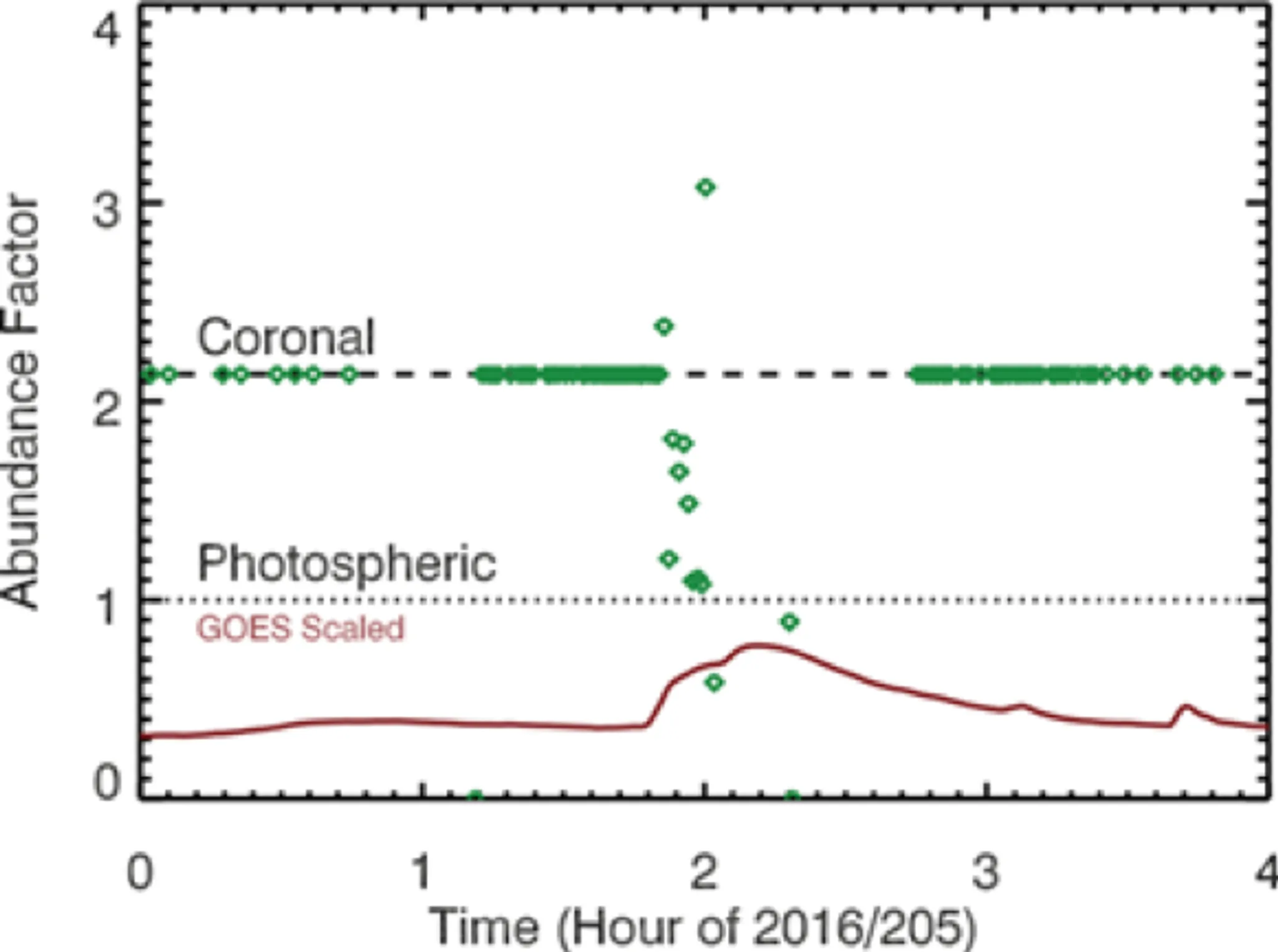 Starting on the left side of the graph, the green dots all match typical coronal measurements — indicating the X-rays came from the corona. At approximately 2 a.m. on July 23, 2016, a M5.0 solar flare occurred. During the solar flare, the composition of the chemicals suddenly looks more like those that typically come from the photosphere — the visible surface of the Sun — rather than the corona above. This indicates that the source of the solar flare — and the heat it produced — came up from the photosphere.