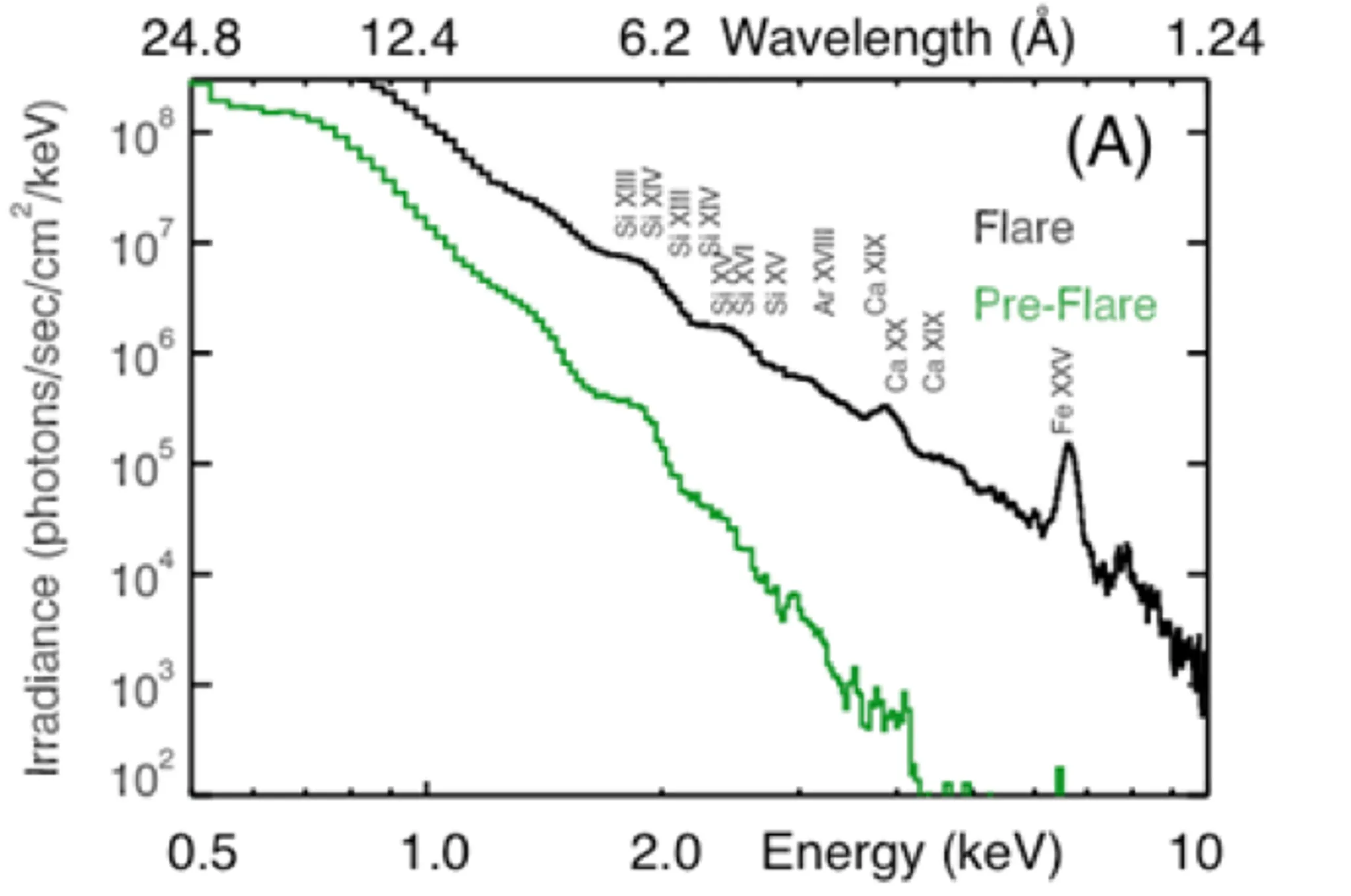 As this graph shows, once the flare hit, all of the measurements shift upwards from the green line to the black line: The overall irradiance of the X-rays increased by a factor of 200. You can also see there are significant spikes at wavelengths/energies corresponding to Iron (Fe XXV), Silicon (Si) and Calcium (Ca), indicating that these chemicals played a large role in the solar flare, and the coronal heating it produced.