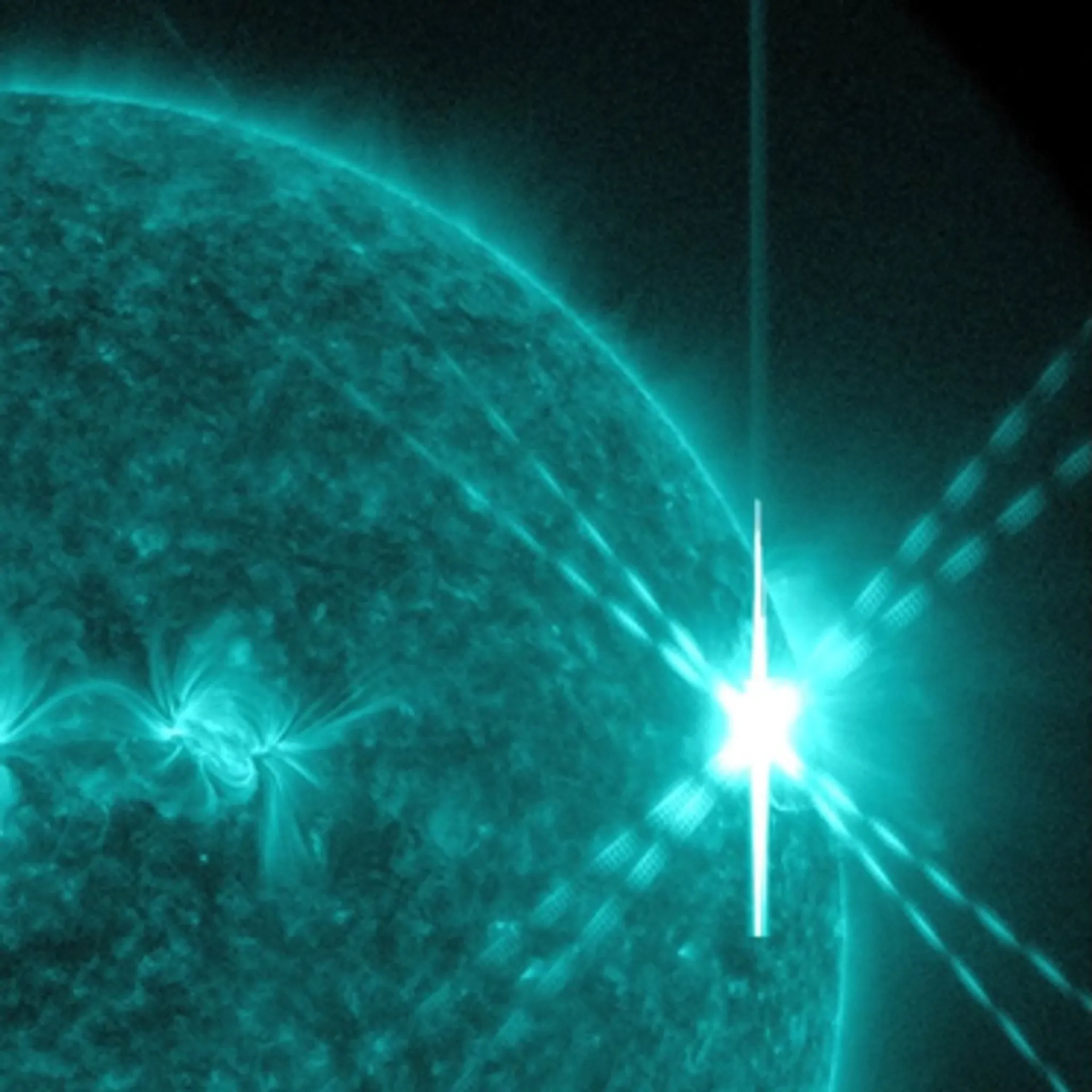 In a different scenario, NASA’s Solar Dynamics Observatory captured this X7 (major) solar flare erupting on Aug. 9, 2011, shown here in extreme ultraviolet light. The flare caused very bright saturation and “blooming” artifacts above and below the flare region, causing extended diffraction patterns to spread out in an “X” formation across the SDO imager.
