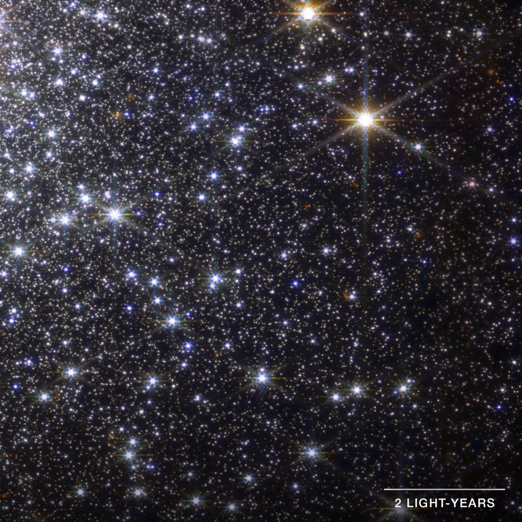 Square image filled with blue, white, yellow, and red points of light of different size and brightness, most of which are stars. The larger and brighter stars show Webb's distinctive diffraction pattern consisting of eight spikes radiating from the center. At the lower right is a scale bar labeled 2 light-years. The scale bar is two-ninths the width of the image, and shows that throughout the image, the distance between adjacent stars is a fraction of one light-year. The density of stars and brightness of the image is greatest in the upper left portion of the image where the stars are much closer together, and decreases gradually toward the bottom right where they are farther apart. The number of larger, brighter stars also appears to decrease from the upper left toward the lower right.