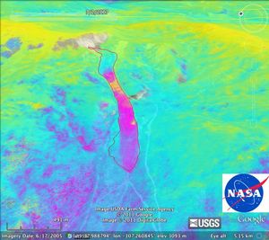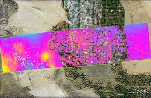 This image shows NASA's UAVSAR interferogram swath overlaid atop a Google Earth image. NASA airborne radar images show the continuing…