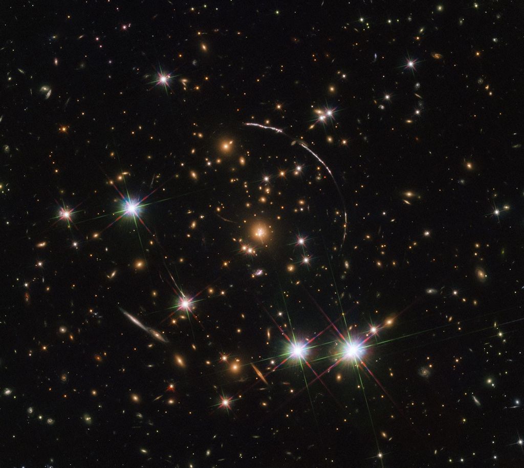 A massive, spacetime-warping cluster of galaxies is the setting of today’s NASA/ESA Hubble Space Telescope image. The galaxy cluster in…