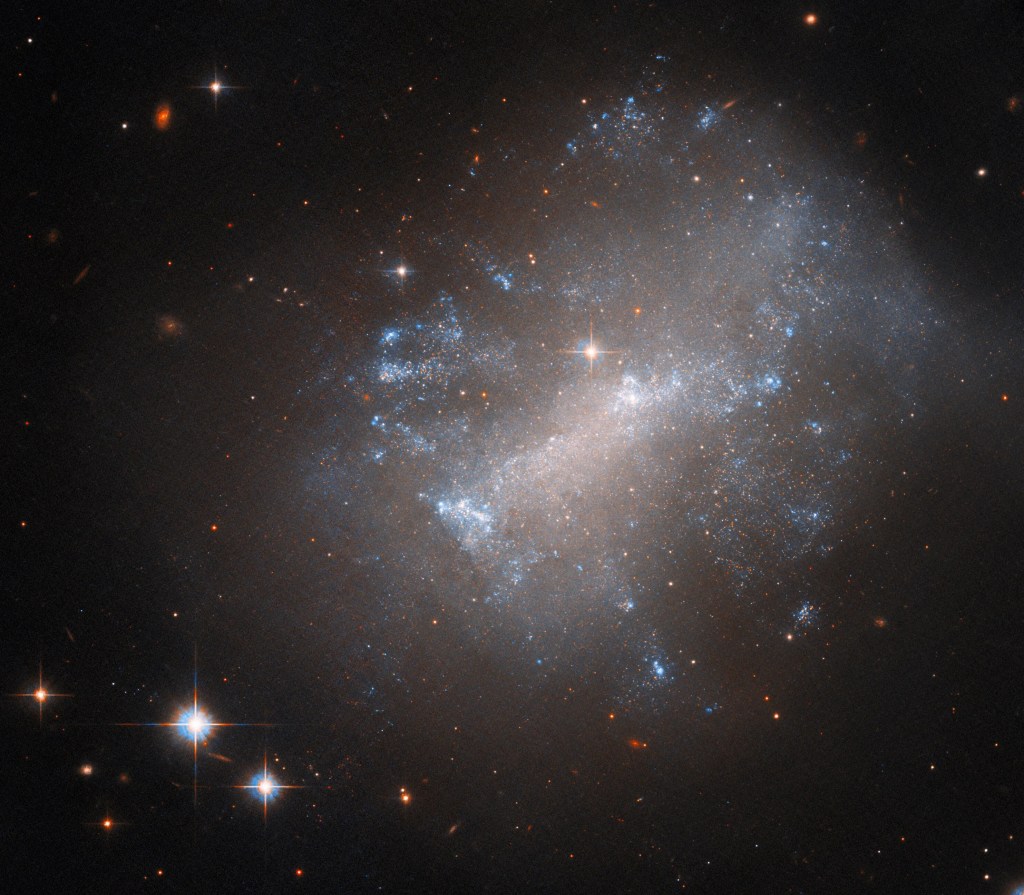 This NASA/ESA Hubble Space Telescope image features the dwarf irregular galaxy NGC 5238, located 14.5 million light-years from Earth in…