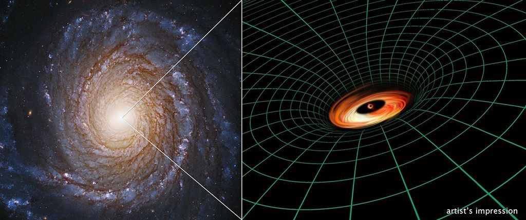 This image shows two views of the Circinus galaxy, one captured by the Hubble Space Telescope and the other by…
