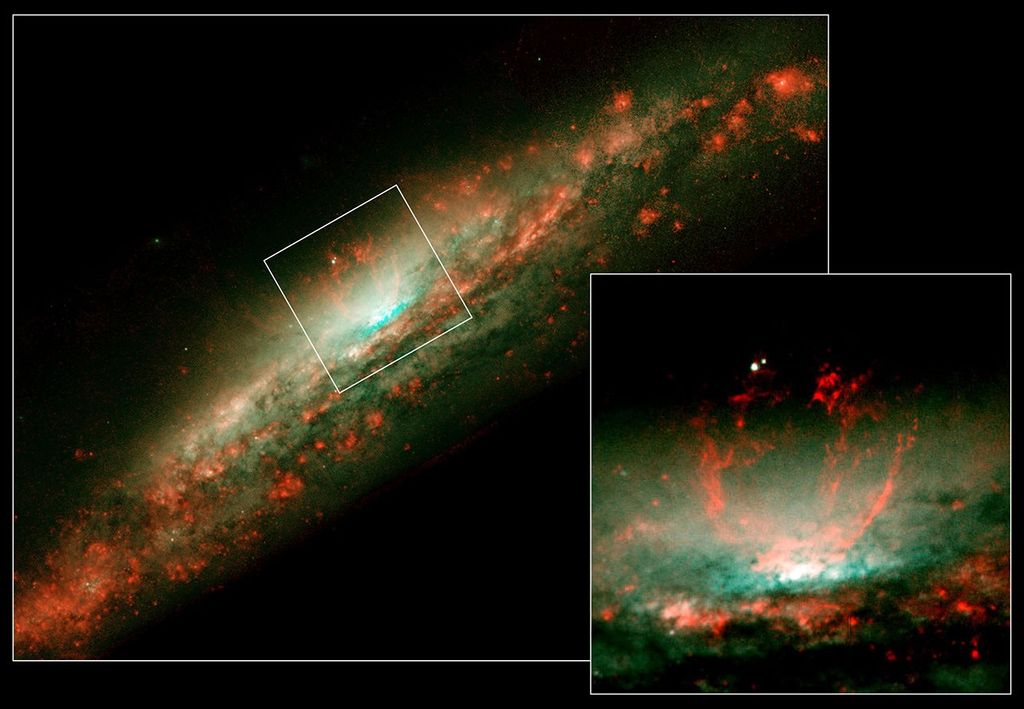 This image shows two views of the Circinus galaxy, one captured by the Hubble Space Telescope and the other by…