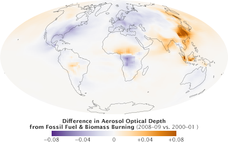Satellites that measure the distribution of aerosols have observed a similar trend. Measurements of aerosols collected by Sea-viewing Wide Field-of-view Sensor (SeaWiFS) between 1997 and 2010 showed significant increases in fine particles over India and China and decreases over North America and Europe.