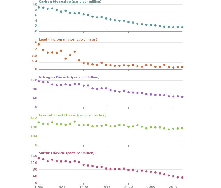 A network of ground-based air pollution sensors, operated by state and federal agencies, has measured decreases of more than 50 percent for five of the six key air pollutants regulated by the Environmental Protection Agency. Levels of lead, a heavy metal that can lead to serious neurological problems, dropped 91 percent between 1980 and 2012, mainly because of the shift to unleaded gasoline. The widespread adoption of catalytic converters led to a similarly drastic reduction in carbon monoxide (83 percent). Sulfur dioxide, which inflames lungs, has declined by 78 percent, mainly due to the installation of scrubbers on coal-fired power plants. Levels of nitrogen dioxide, a reddish-brownish gas that causes respiratory problems, fell 60 percent.