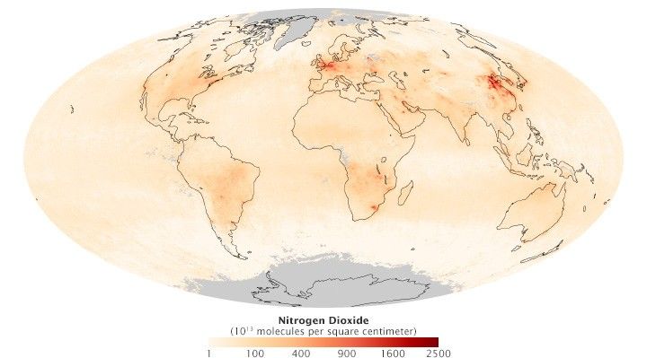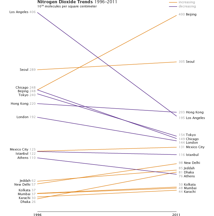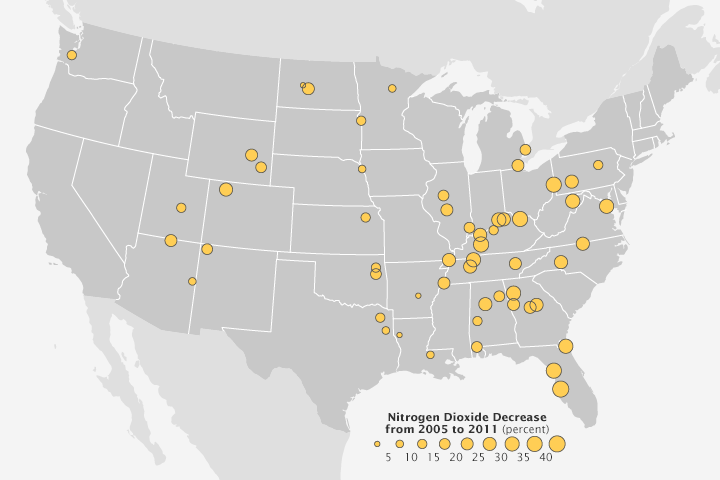 An analysis of satellite measurements of nitrogen dioxide levels over large cities between 1996 and 2011 is representative. Conducted by researchers from the University of Bremen, the study showed that most of the developed world—including Western Europe, the United States, Japan, and Australia—saw nitrogen dioxide levels fall as much as six percent per year. Nitrogen dioxide increased around large cities in China, India, and the Middle East, with Beijing, New Delhi, and Tehran seeing increases of 7 to 8 percent per year.