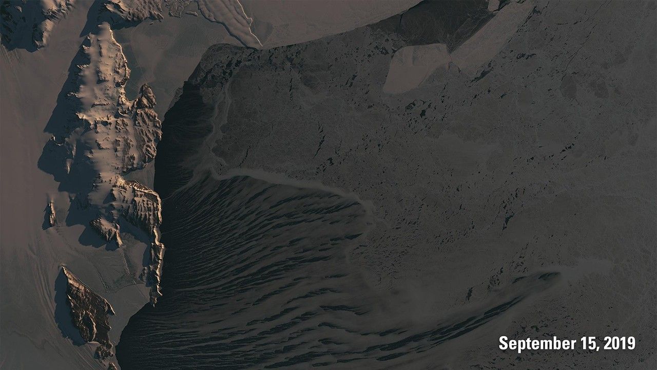These images contrast the sunlight Antarctica receives near spring equinox (September image) and summer solstice (December image). The low sun angles near equinox create longer shadows that reveal the ruggedness of the mountains. The higher angles near solstice shorten the shadows and brighten the landscape, while the marked reduction in sea ice exposes more of the darker ocean. Images taken by Landsat 8. Source: U.S. Geological Survey’s National Land Imaging Image Collections