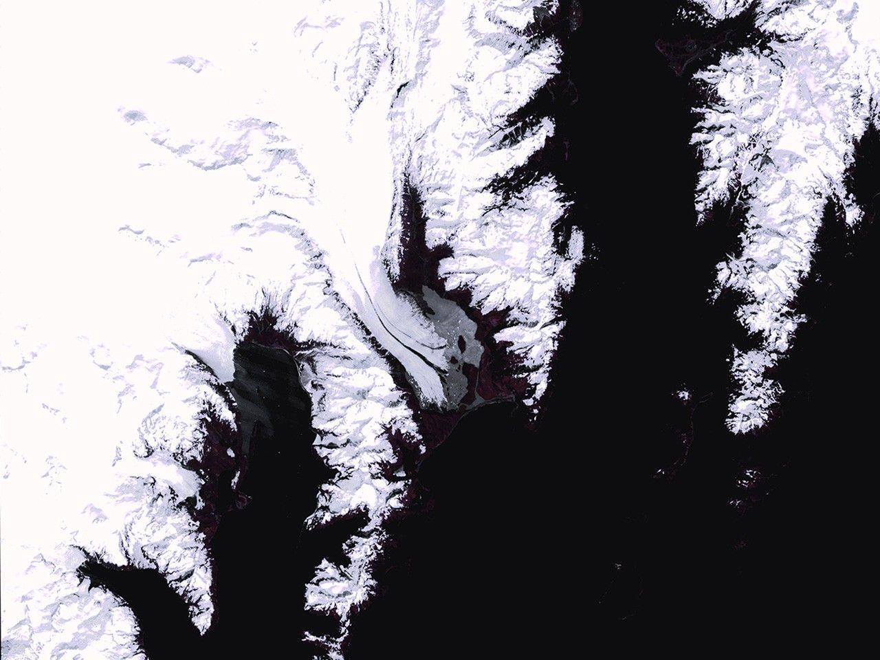 This series of images shows the shrinkage of Bear Glacier from 1980 to 2011. Warming in the region has caused less buildup of snow and therefore less material for glacial growth. As the glacier has receded, ice at the end of the glacier has broken off the main body, forming icebergs in the open water. The 2011 image shows considerable retreat of the glacier's "tongue." Also see this image pair of the same glacier.   Left image taken by the Multispectral Scanner onboard Landsat 3. Center image taken by the Thematic Mapper sensor onboard Landsat 4. Right image taken by the Enhanced Thematic Mapper Plus sensor onboard Landsat 7. Source: U.S. Geological Survey (USGS) Landsat Missions Gallery, "Bear Glacier, Alaska," U.S. Department of the Interior / USGS and NASA.