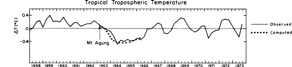 The simple model also allowed Hansen to simulate the climate impact of Mount Agung’s eruption 15 years after the event. The model indicated that loading the atmosphere with volcanic aerosols should have caused a global cooling—a prediction that agreed pretty well with observed temperature data.
