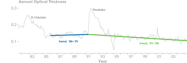 In 2007, Michael Mischenko, of NASA GISS, published a paper in the journal Science in which he reported tropospheric aerosols have indeed declined slightly over the last 30 years. The net effect is that more sunlight passes through the atmosphere, slightly brightening the surface. This increased exposure to sunlight could partially account for the increase in surface temperature that Mischenko and Hansen observed over the same time span.