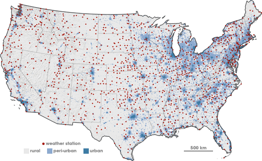 His team also modifies the data from stations located in densely populated areas by removing the long-term bias of these “urban heat islands.” The team uses satellite data to determine if a given station is in an urban or near-urban location. If so, then the team uses the nearest rural stations to determine the long-term trend at the urban site. If there are no rural neighbors, then Hansen’s team throws out the urban station data.