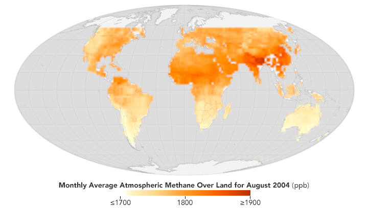 In 2011, Frankenberg and colleagues published their maps, showing average methane concentrations around the world between 2003 and 2009. The maps revealed notable variations and hot spots that were not obvious from ground-based measurements or aircraft surveys. For instance, the Sichuan Basin—a low-elevation, fertile area in southwestern China—had the highest concentrations of methane in the world. The region has an active natural gas industry, and it is also dense with rice paddies and animal farms. The Indo-Gangetic plain, northern Thailand, and eastern China—all major farming areas in Asia—also scored high for methane, while the arid Tibetan Plateau had unusually low levels. In Africa, the swampy Sudd wetlands of southern Sudan had the highest concentrations, while the fertile Fergana Valley in Uzbekistan stood out in central Asia.