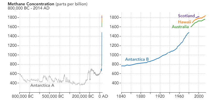 The long-term, global trend for atmospheric methane is clear. The concentration of the gas was relatively steady for hundreds of thousands of years, but then started to increase rapidly around 1750. The reason is simple: increasing human populations since the Industrial Revolution have meant more agriculture, more waste, and more fossil fuel production. Over the same period, emissions from natural sources have stayed about the same.