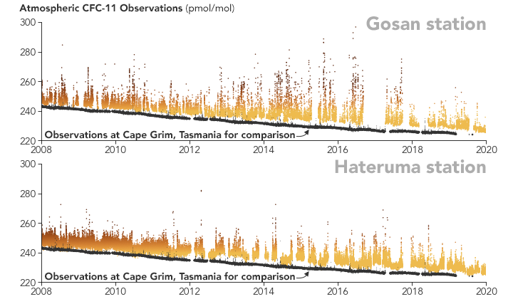 The maps at the top of this page show estimates of the emissions of CFC-11 from eastern China between 2008 and 2019 as calculated by an atmospheric transport model developed by the study authors. The plots above show the concentrations of the chemical as observed by ground-based instruments in the AGAGE network. Note the spikes in the line plot between 2013 and 2017. The Gosan station, run by South Korea’s Kyungpook National University, and the Hateruma Island station, run by Japan’s National Institute of Environmental Studies, were both positioned close enough for researchers to trace most of the new emissions back to eastern China.