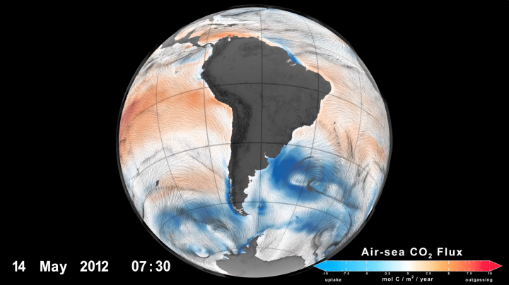 The animation and still image on this page show areas where carbon dioxide was absorbed (blue) and emitted (red) by the global ocean in 2012. (Jump to 1:00 to focus on the Southern Hemisphere.) The data come from the ECCO-Darwin Global Ocean Biogeochemistry Model. The research was funded by the National Science Foundation, NASA, and the National Oceanic and Atmospheric Administration.