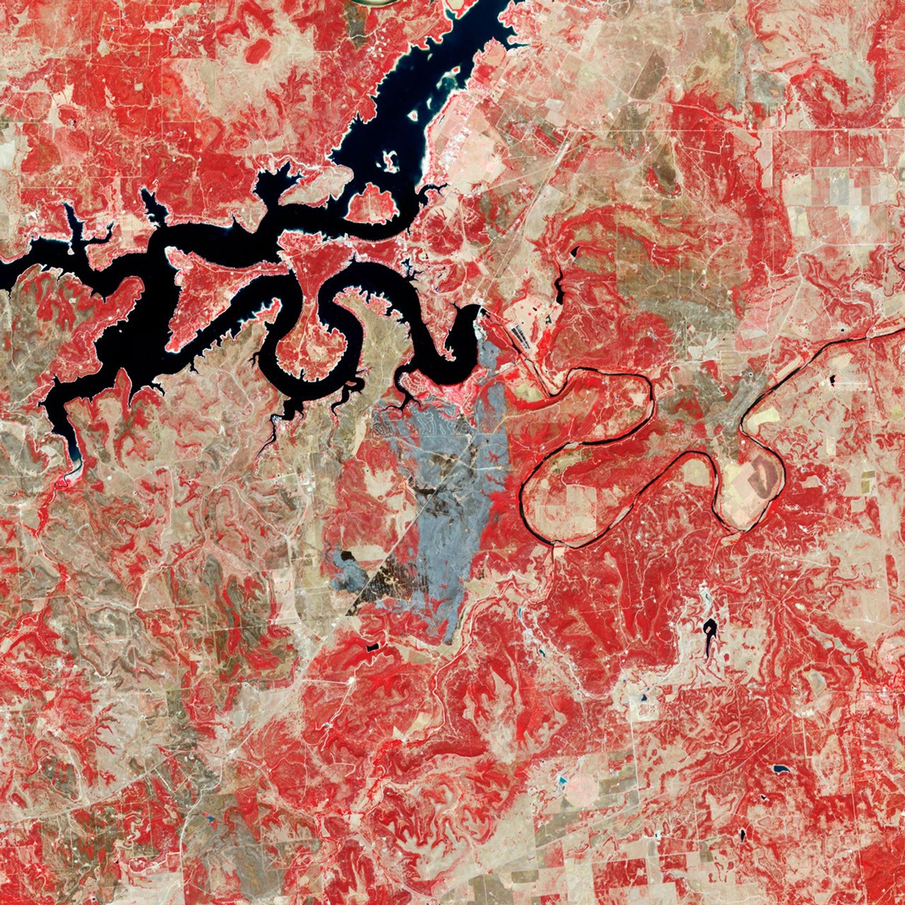 The Advanced Spaceborne Thermal Emission and Reflection Radiometer (ASTER) on NASA’s Terra satellite captured this false-color image of the Ranch 101 burn scar on September 3, 2011. The burn scar is gray, vegetation is red, and bare or sparsely vegetated ground is tan. Water is navy blue.