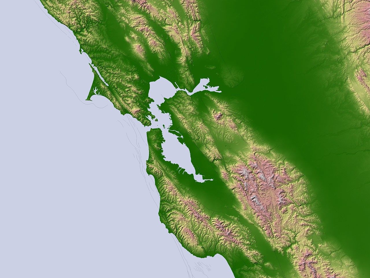 This image shows the topography of the region using data fromNASA’s Shuttle Radar Topography Mission. Low elevations are green,with yellow, pink, and white representing progressively higher elevations.Major geologic faults are marked with white lines. The San Andreas Faultruns in a northwest-southeast line along the coast. The numbers on the faultline indicate how far the ground surface slipped at that location as aresult of the 1906 earthquake. Also labeled in the image is the HaywardFault on the eastern side of San Francisco Bay. The Hayward is one of thefaults with a high likelihood of a major earthquake in coming decades. Thatfault runs through Oakland and Berkeley.