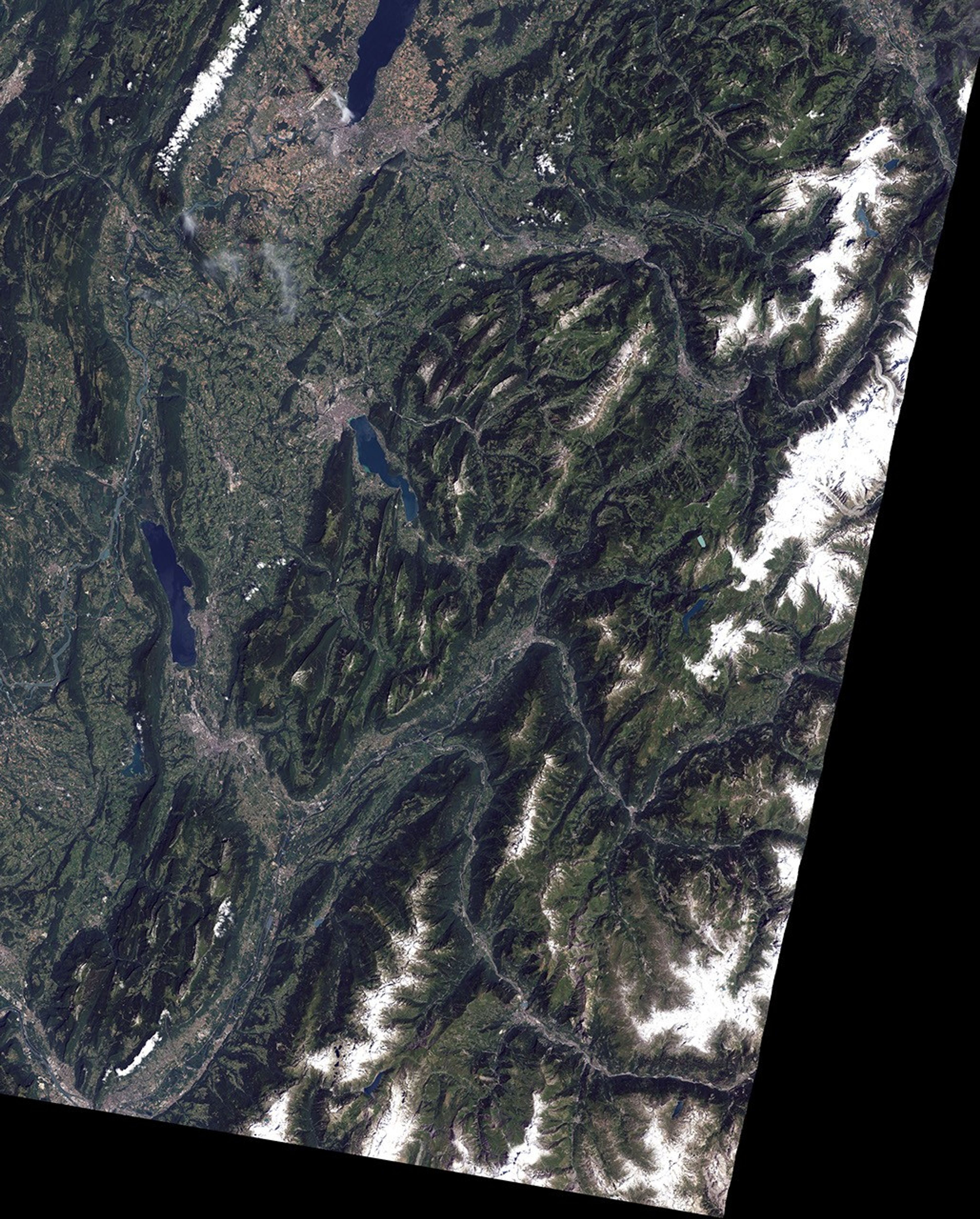This image from the Enhanced Thematic Mapper Plus sensor on NASA’s Landsat satellite shows the terrain of the 17th stage of the race—the final day in the mountainous terrain of the Alps. Deep green forests line the lower slopes of mountains, while the summits of many of the peaks appear lighter green because they are beyond the elevation where trees can grow. Some of the summits are capped by glaciers. The rugged terrain is carved by gray ribbons of rivers and creeks.