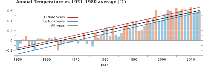 It has been 38 years since the recording of a year with cooler than average temperatures. The graph below shows how the long-term temperature trend has continued to rise even when El Niño and La Niña events skew temperatures warmer or colder in any one year. Orange bars represent global temperature anomalies in El Niño years, with the red line showing the longer trend. (The classification of years comes from the NOAA Oceanic Niño Index.) Blue bars depict La Niña years, with a blue line showing the trend. El Niño/La Niña neutral years are shown in gray, and the black line shows the overall temperature trend since 1950. Note that even the La Niña years are warmer than they used to be.