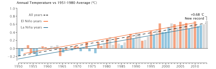 3. NOAA National Climatic Data Center (2015, January 16) 2014 Earth's warmest year on record; December 2014 record warm; Global oceans also record warm for 2014. Accessed January 16, 2015.