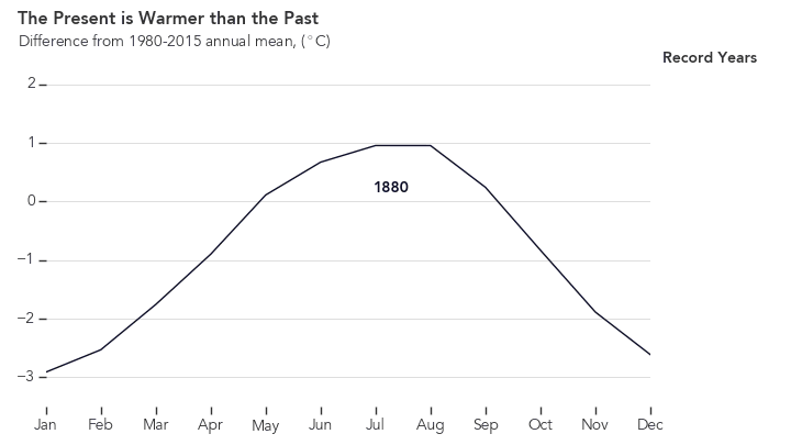 This animation shows the seasonal cycle in global temperature anomalies for every month since 1880. Each line shows how much the global monthly temperature was above or below the global mean from 1980â2015. The column on the right lists each year when a new global temperature record was set. These seasonal anomalies are drawn from the Modern-Era Retrospective analysis for Research and Applications, version 2 (MERRA-2), a model run by NASAâs Global Modeling and Assimilation Office.