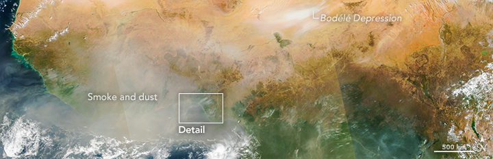 For much of the region, the fires are so small and widely spaced that the smoke has become diffuse. A thick plume of dust from the Bodélé Depression in Chad—a dried up lake bed has become one of the largest sources of dust in the world—also mixes with the smoke to make the image fuzzy and opaque in some places.