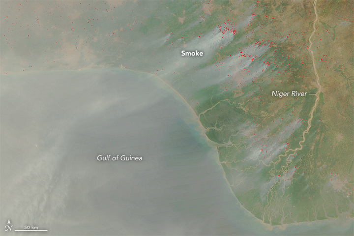 This close-up, detailed view shows large numbers of agricultural fires near the Niger River Delta. Notice how the plumes of smoke tend to be larger and more distinct in this forested area, probably because the fires are burning denser vegetation in fairly humid conditions. Dense, moist vegetation tends to produce light-colored smoke, while grassland fires in dry environments tend to produce dark smoke with more black carbon aerosols.