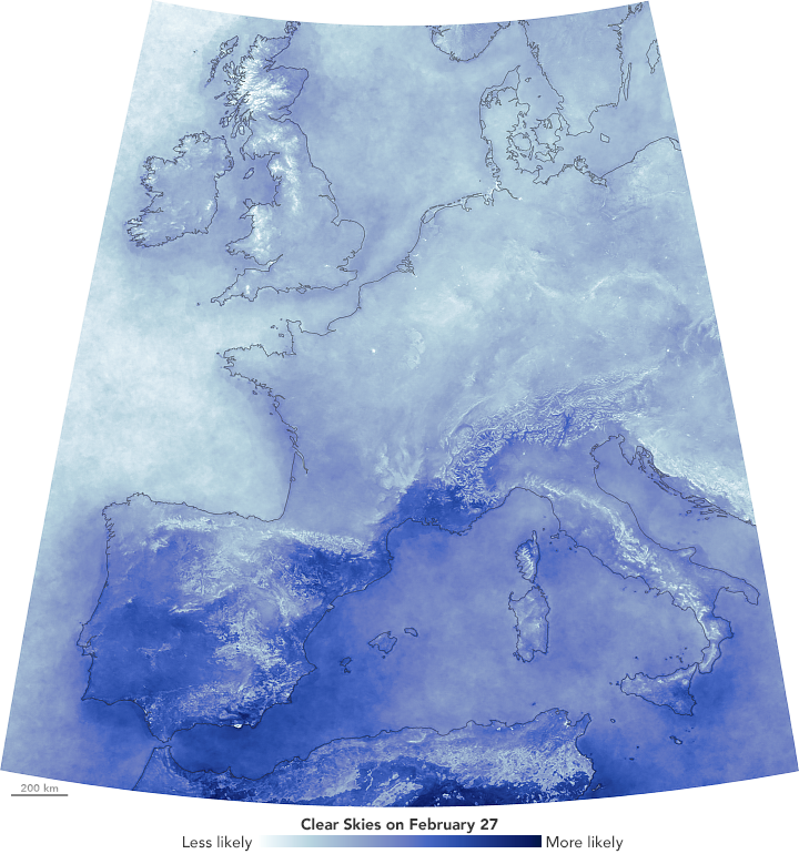 As shown in the cloud probability map above, it is usually quite cloudy in western and central Europe in late February. The map shows average cloudiness since 1999 as observed by MODIS for seven days before and after February 27 since 1999.