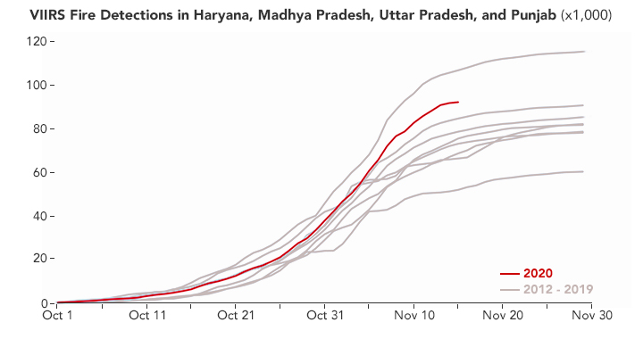 Satellite data indicates that paddy fires were quite numerous this year, particularly in the state of Punjab. The Visible Infrared Imaging Radiometer Suite (VIIRS) sensor on the Suomi NPP satellite made nearly 87,000 active fire detections through mid-November across four rice-growing states in the region—Punjab, Haryana, Madhya Pradesh, and Uttar Pradesh. That is the second most the sensor has observed for the post-monsoon period since VIIRS first collected data in 2012. About 80 percent of the fires in 2020 occurred in Punjab.