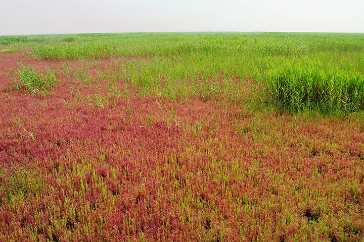 The image on the left, acquired by the Thematic Mapper on Landsat 5, shows the estuary in 1986; the image on the right, from the Operational Land Imager-2 (OLI-2) on Landsat 9, shows the same area in 2022. Both images were acquired in September, around the time when seepweed reaches its deepest red. The green areas along the river are dominated by Phragmites australis, a type of reed. The yellow areas are rice fields. The photo below shows seepweed (red) in the foreground transitioning into Phragmites australis (green) in the background.