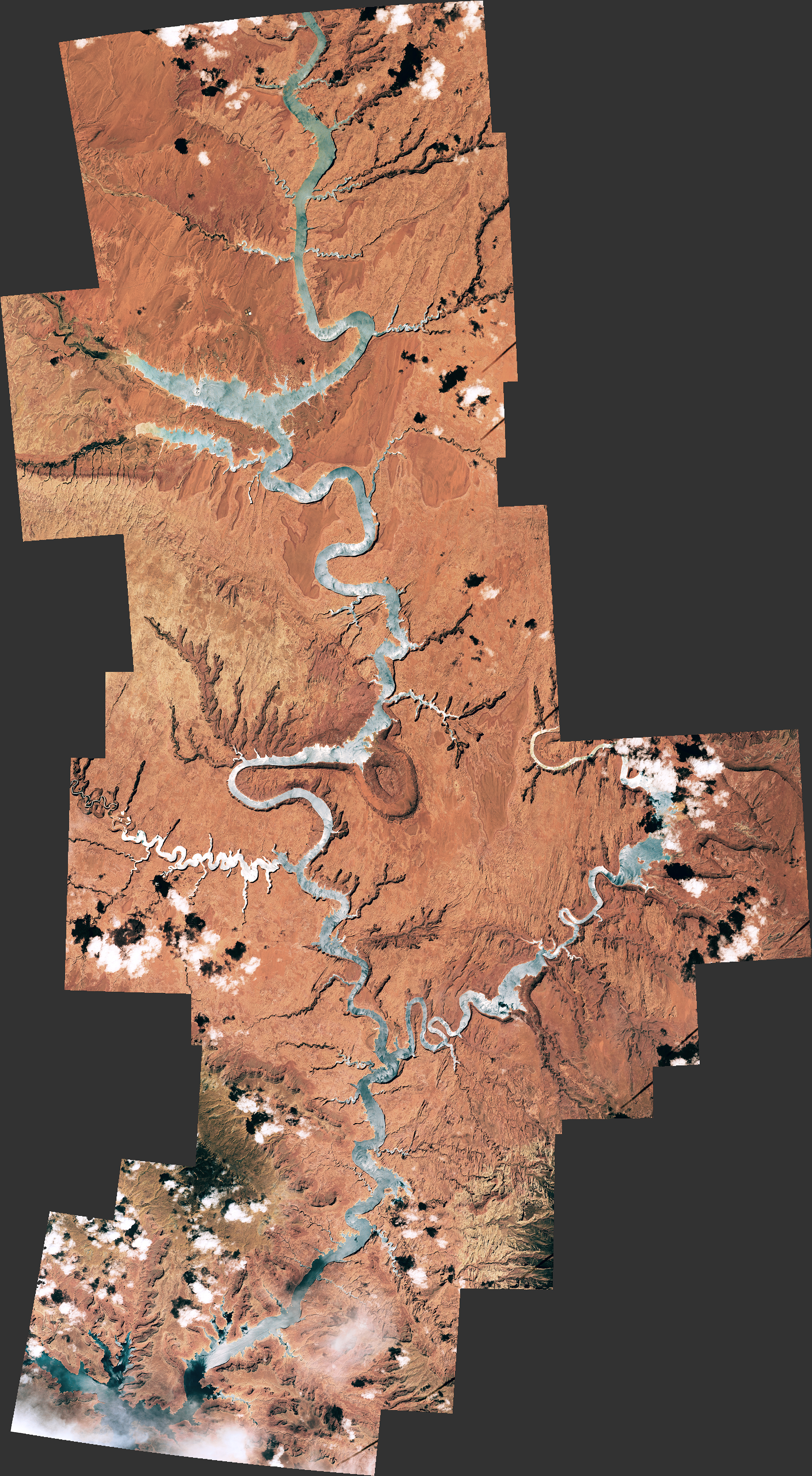From above, the view of Glen Canyon is equally arresting. In 2016, an astronaut aboard the International Space Station took several photographs that were combined to make this long mosaic. The water has an unnatural shade of blue because of sunglint, an optical phenomenon that occurs when sunlight reflects off the surface of water at the same angle that a camera views it.
