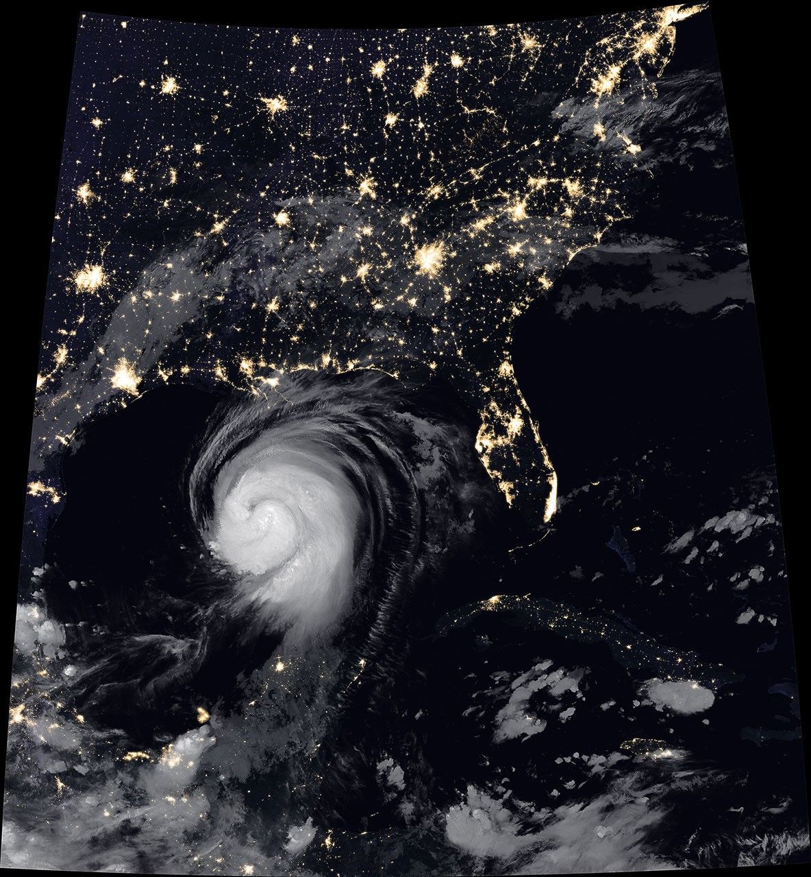 The Visible Infrared Imaging Radiometer Suite (VIIRS) on NOAA-20 acquired this image of Hurricane Laura at 2:20 a.m. Central Daylight Time on August 26, 2020. Clouds are shown in infrared using brightness temperature data, which is useful for distinguishing cooler cloud structures from the warmer surface below. That data is overlaid on composite imagery of city lights from NASA’s Black Marble dataset.
