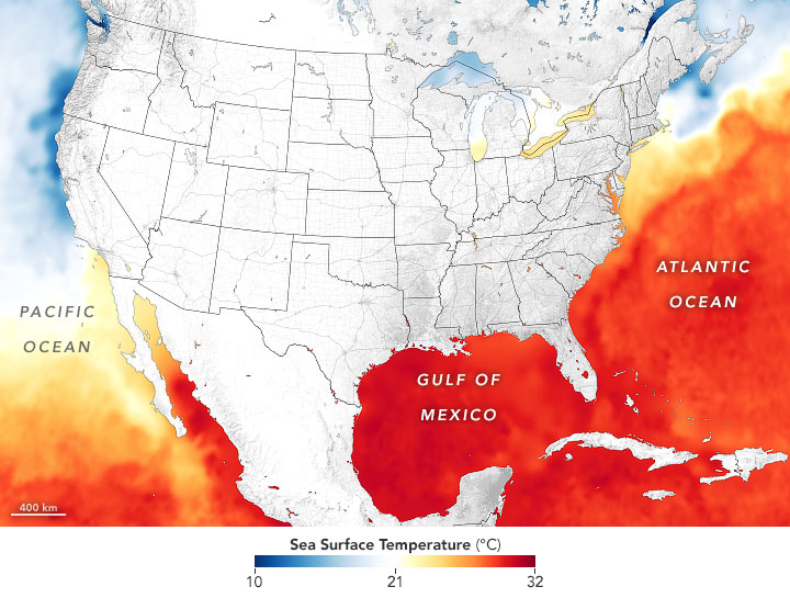 The map below shows sea surface temperatures (SSTs) around the continental U.S. and Mexico as of August 25. Water temperatures in the Gulf of Mexico were running about one degree Celsius (1.8° Fahrenheit) above average. SSTs above 27.8° Celsius (82° Fahrenheit) are generally needed to sustain and intensify hurricanes. Laura underwent a period of rapid intensification as it passed over the warm Gulf waters, with winds intensifying by 50 miles (80 kilometers) per hour over a 24-hour period.