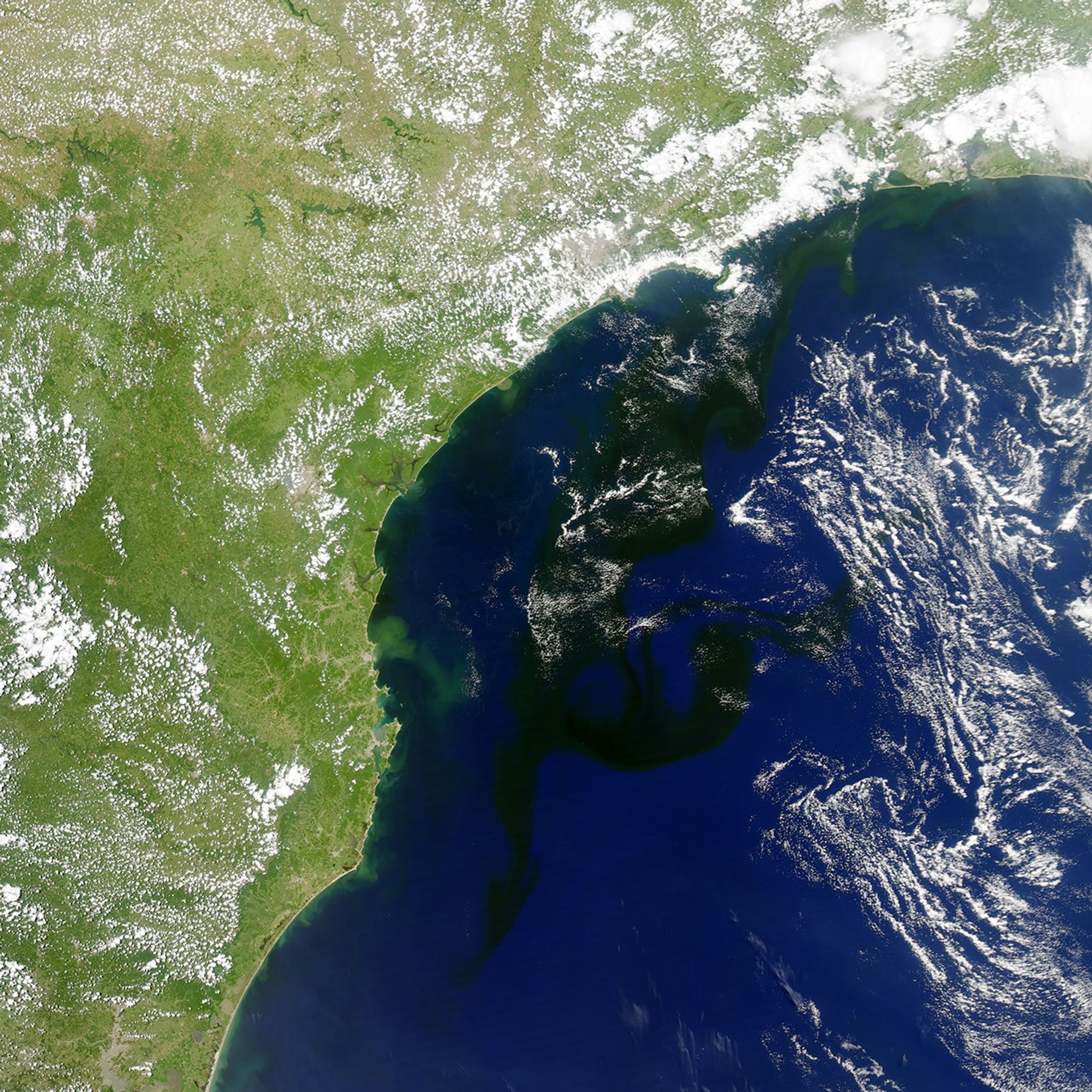 On January 19, 2014, the Moderate Resolution Imaging Spectroradiometer (MODIS) on NASA’s Aqua satellite captured this image of a bloom of microscopic organisms off the southeastern coast of Brazil. Note how the waters of the South Atlantic are darkened in patches stretching as much as 800 kilometers (500 miles) from south to northeast across the continental shelf. In the image, the puffy strands of white over the sea and inland are clouds.