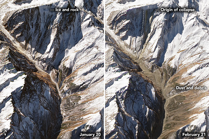 What triggered the rock and hanging glacier to fall in Uttarakhand remains an open question. University of Calgary geomorphologist Dan Shugar is among a group of scientists trying to find an answer to that and other questions about the disaster. As part of the effort, they are analyzing several types of meteorological, geologic, and modeling data to supplement and contextualize the satellite imagery. They hope to determine what role weather conditions, the tectonic environment, and shifting climate conditions might have played in priming the rock and ice for collapse.