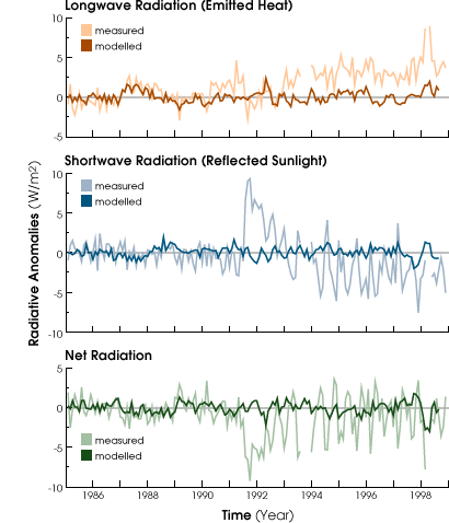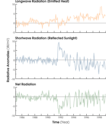 “What we found was a 4-watt-per-square-meter change within the climate system that the climate models did not predict,” says Wielicki. Over the last 15 years, without anyone’s knowledge, the amount of thermal, long-wave radiation escaping the atmosphere above the tropics increased by 4 watts per square meter. At the same time the amount of reflected sunlight, which is mostly in the form of short-wave visible and near-visible light, decreased by 4 watts per square meter. The change appears to have occurred gradually over the past decade and a half and as such was likely completely independent from El Niño (Wielicki et al. 2002). Though 4 watts of energy is only a fraction of the 342 watts per square meter of solar energy that hits the Earth’s outer atmosphere, the Earth’s energy budget is usually extremely stable over the long term, and changes of more than a couple of watts are significant.