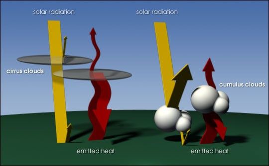 Possibly no part of the climate system is more unpredictable than the interaction between atmospheric water and radiation emitted by the Sun and the Earth. At any given time, a small sea of water floats above our heads in the form of clouds, ice, and water vapor. The form and position the water takes in the sky changes the way it interacts with solar and thermal radiation. Clouds, especially low-lying, thick clouds, reflect an enormous amount of sunlight back into space and keep it from overheating the Earth. High-flying, wispy clouds and water vapor absorb greater amounts of outgoing thermal (heat) radiation, which is generated by the surface of the Earth after it is warmed by the Sun. Along with greenhouse gases, such clouds and water vapor contribute to keeping the average temperature of the Earth’s surface from dropping to Arctic levels year round.