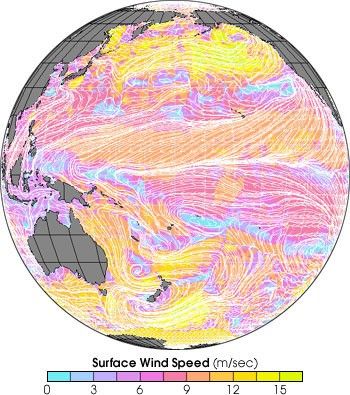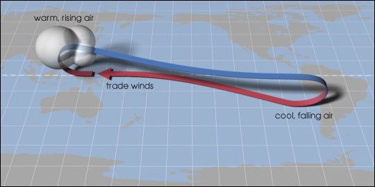 In the tropics, there are two big circulation patterns that control most of the airflow through the troposphere like giant conveyor belts. The Walker circulation transports air east and west along both sides of the equator. Air currents rise high above the warm pool over the far western Pacific and the Indian oceans and then flow east towards the coasts of the Americas. The air currents then descend and travel west, skimming the surface of the Pacific and creating the trade winds. An El Niño or La Niña occurs when this last leg of the Walker circulation breaks down or speeds up. The other major circulation, known as the Hadley circulation, transports air both north and south away (on average) from the equator. In both hemispheres, air in equatorial region rises due to the warmth emitted from the tropical waters and travels away from these regions towards the cooler mid-latitudes. When the air hits roughly 30 degrees latitude on either side of the equator, it cools, plunges back down toward the ocean, and then flows along the surface back toward the equator, thus completing the loop. Together, these two circulation patterns are known as the Hadley-Walker cell.