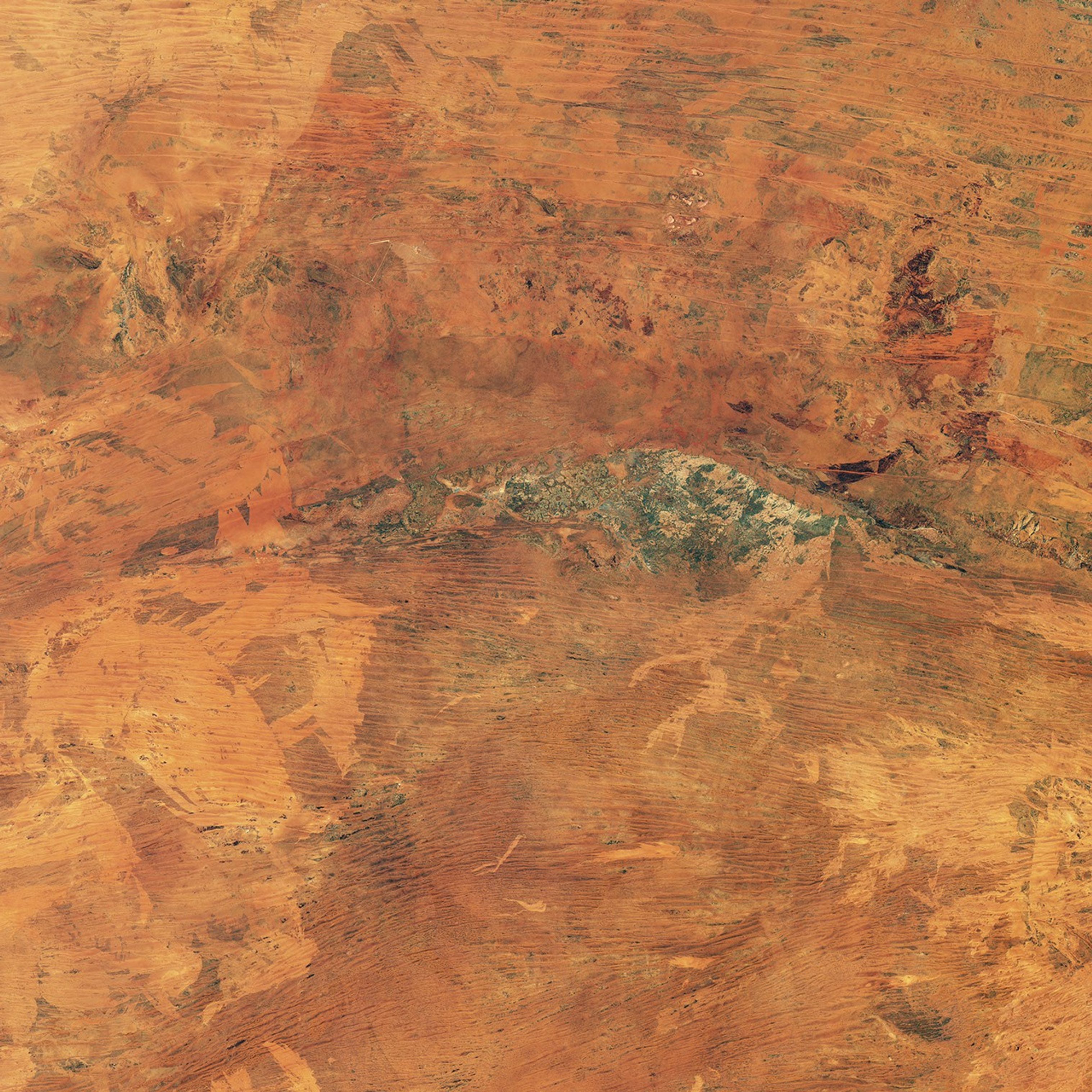 The Gibson Desert in Western Australia is a vast, desolate, and beautiful place. Aside from patchy tufts of desert grass and the occasional shrub or tree, the fire-prone landscape is mainly one of undulating red dunes, desert pavement, and sandy plains.
