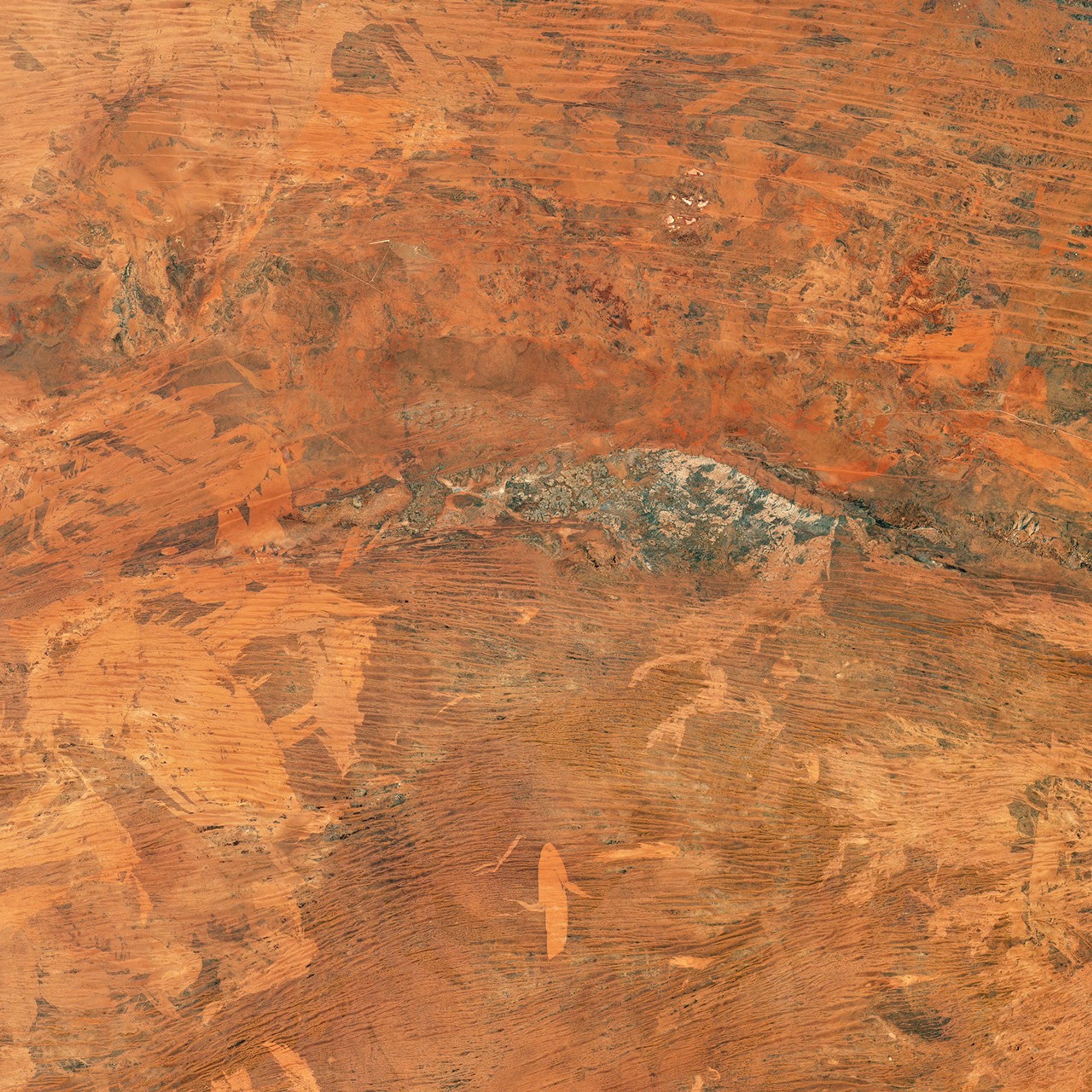 The Gibson Desert in Western Australia is a vast, desolate, and beautiful place. Aside from patchy tufts of desert grass and the occasional shrub or tree, the fire-prone landscape is mainly one of undulating red dunes, desert pavement, and sandy plains.