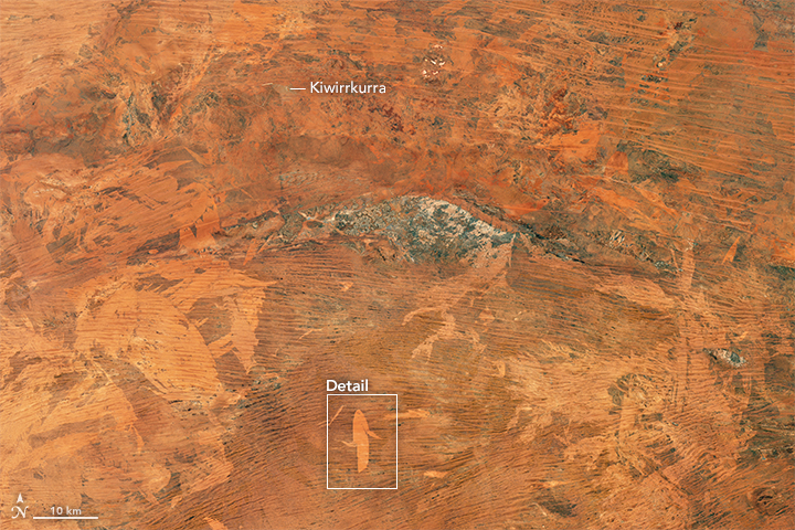 On November 19, 2015, the Operational Land Imager (OLI) on Landsat 8 satellite acquired the image at the top of the page—a burn scar in the Gibson Desert. The burn scar is light orange compared to the darker orange areas that have not burned recently. The vegetation on the unburned parts of the landscape is primarily the desert grass Triodia (see photo below). The gray area south of Kiwirrkurra is a range of stony hills. Imagery collected by the Moderate Resolution Imaging Spectroradiometer (MODIS) sensors on NASA’s Aqua and Terra satellites indicate that a thunderstorm on November 7 triggered the fire.