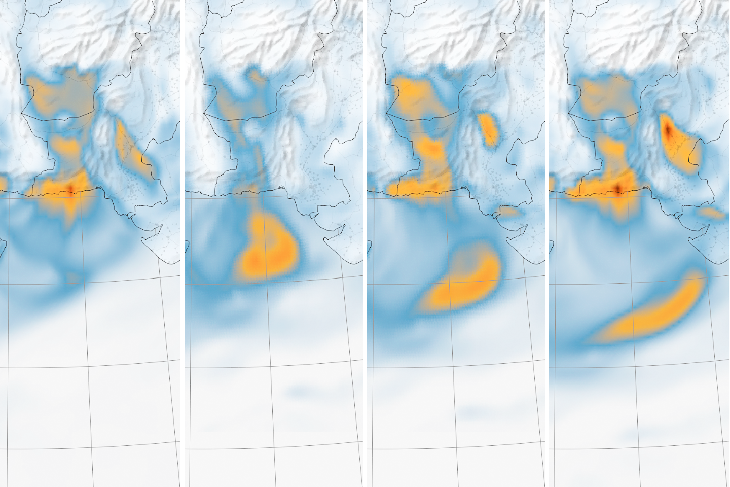 The series of maps below show dust spreading toward the south over Pakistan, India, and the Arabian Sea during six-hour intervals on January 12. The data used to generate the maps came from NASA’s Goddard Earth Observing System (GEOS) modeling system, which assimilates data from a variety of satellite, aircraft, and ground-based observing systems.