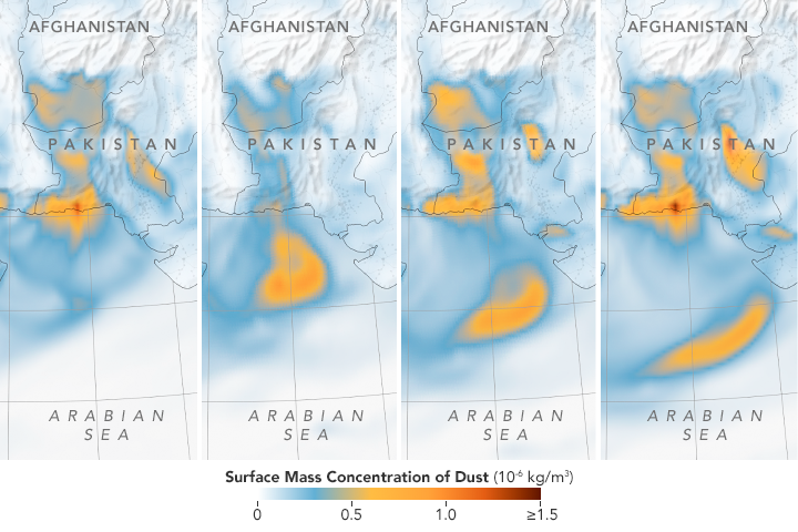The series of maps below show dust spreading toward the south over Pakistan, India, and the Arabian Sea during six-hour intervals on January 12. The data used to generate the maps came from NASA’s Goddard Earth Observing System (GEOS) modeling system, which assimilates data from a variety of satellite, aircraft, and ground-based observing systems.
