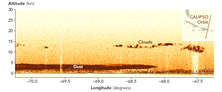 The data in the transect below reveal the height of the dust over the Dominican Republic as observed by the Cloud-Aerosol Lidar with Orthogonal Polarization (CALIOP) instrument on the CALIPSO satellite on June 23, 2020. Reaching roughly 4 kilometers (2.5 miles), the top of the plume was a bit higher than most; there was also plenty of dust at or below 1 kilometer (0.6 miles). As dust crosses the ocean, larger particles fall out first, leaving behind mainly finer and smaller ones, which are especially problematic for human health.