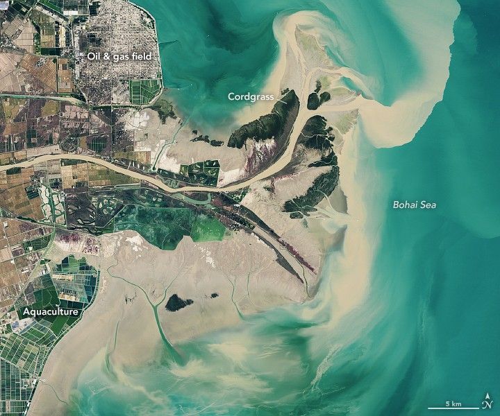 On the youngest land, different types of vegetation—notably the cordgrass Spartina alterniflora—have spread widely, creating dense new pockets of green in the 2020 image. The invasive cordgrass first reached the Yellow River Delta in the late-1980s, and began to spread rapidly in the intertidal zone in the early 2000s. While the grass does stabilize the shoreline, it has crowded out a local reed species (Phragmites australis) and an annual plant (Suaeda salsa), significantly reducing how much carbon the delta ecosystem stores and increasing methane emissions. By replacing S. salsa, the cordgrass has also made the area less habitable for certain rare birds, including red-crowned cranes and black-billed gulls.