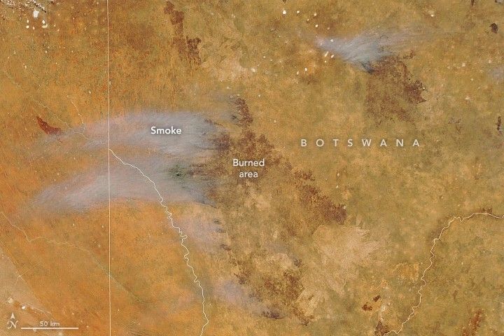 The dry season in southwestern Botswana typically runs from May to September. By September, the parched veld grasslands and savannas of Kgalagadi Transfrontier Park have generally seen so little rain that they are primed to burn. On August 25, 2021, lightning from a passing thunderstorm likely ignited a blaze that then raced through the area during the next two weeks, charring the park as the flames pushed west toward Namibia.
